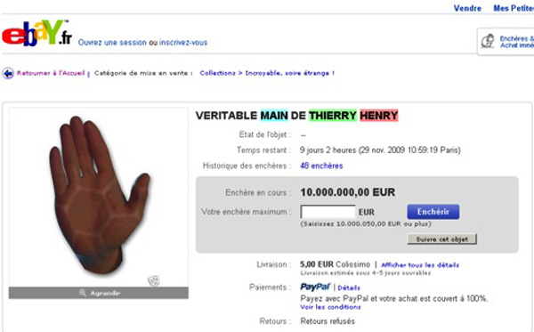 A onda je na eBayu osvanula majica ' Thierry Henry's real hand' (prava ruka Thierryja Henryja) koju možete dobiti samo za jedan euro. Administratorima to nije bilo smiješno pa su ubrzo uklonili taj oglas.