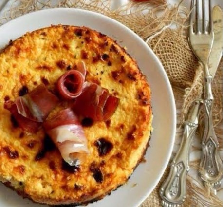 Krekere izmrvite i pomješajte s otopljenim maslacem. Smjesu utisnite u okrugli kalup obložen papirom za pečenje (promjera 18 cm) i stavite peći u zagrijanu pećnicu na 180°C desetak minuta. Izmješajte sve sastojke za nadjev i ulijte na polupečenu podlogu od krekera, te vratite peći još pola sata na 190°C. Po želji ukrasite ružicama od pršuta...