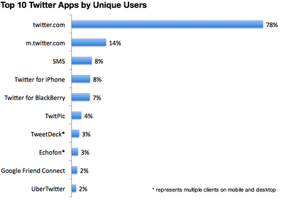 Od ukupnog zbroja jedinstvenih korisnika, 78 posto korisnika Twitteru pristupa putem web-stranice Twitter.com, 14 posto njih to čini putem mobilne verzije m.twitter.com, osam posto putem SMS-a, osam posto putem iPhone aplikacije, a sedam posto preko BlackBerryja.