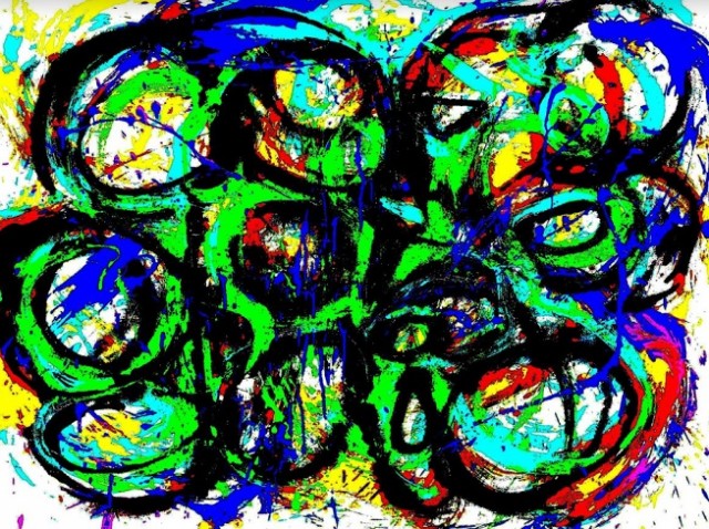 Raznovrsna kombinatorika sukladnog gibanja krugova ili bučna sudarajuća igra ovala u volumenima kolora, koji se spretno prelojevaju s jednog na drugi kraj vwelikog formata, ostavljajući za sobom vidljive oznake kretanja, znakove svoga postojanja i svoga življenja.