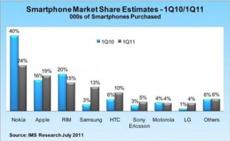 Istraživanje IMS-a pokazalo je i kako su u periodu između prvog kvartala 2010. i prvog kvartala 2011.g Apple i brojne druge tvrtke koje se temelje na Android sustavu povećale svoje udjele na tržištu, nauštrb nekoć velike Nokie, koja ubrzano gubi svoju nedodirljivu poziciju na tržištu. Osim Nokije, pad je doživio još jedino i Blackberry.