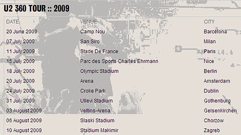 Na U2.com danas je potvrđeno da će turneja grupe U2 pod nazivom "360°" započeti 30. lipnja na Nou Camp stadionu u Barceloni. Turneju 360° sponzorira BlackBerry®, a ovo je prva stadionska turneja nakon posljednje koja je nosila naziv Vertigo iz 2005/06. Ova je turneja najavljena nakon izdavanja dugoočekivanog albuma No Line On The Horizon. U produkciji Live Nation Global Touringa, U2 360° posjetit će 14 gradova diljem Europe uključujući Milano, Gothenburg, Amsterdam, Pariz, Nicu, Dublin, Chorzow, Berlin, Gelsenkirchen, ZAGREB, London, Sheffield i Glasgow prije nego li turneju završe u na Millennium stadionu u Cardiffu, 22. kolovoza. Nakon europske turneje slijedi sjevernoamerička turneja - prvi koncert održat će se u Chicagu, na Soldier Fieldu, 12. rujna 2009.