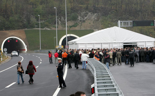 Puni profil autoceste Rijeka-Zagreb u ukupnoj dužini od 146,5 kilometara otvorio je danas kod južne strane tunela Tuhobić predsjednik Vlade Ivo Sanader.